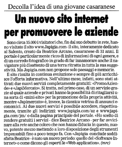 Gazzetta del Mezzogiorno del 18 settembre 2001![]() Questo articolo č stato pubblicato sul Quotidiano pugliese, nella sezione dedicata al Salento "Gazzetta di Lecce" il 18 settembre 2001, in occasione del lancio dei servizi gratuiti del Portale: PromoAziende e japiMercato. Mediante questi servizi, Japigia ha dato possibilitā agli Imprenditori salentini (e non solo...) di promuovere, gratis la propria attivitā economica. Redatto a firma della Dott.ssa M. R. Cristaldi, corrispondende da Casarano della testata giornalistica. Documento creato il 08/03/2004 (16:23)Ultima modifica del 16/03/2011 (13:56) Area di StampaFortune Cookie...Il tacere è rispondere a chi parla senza ragione |